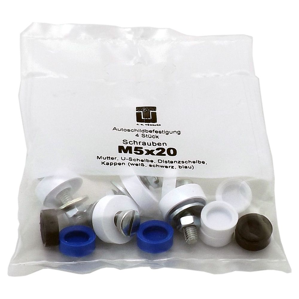 Sie erhalten ein Set Befestigungsschrauben für zwei Kfz-Kennzeichen oder Kennzeichenhalterungen.